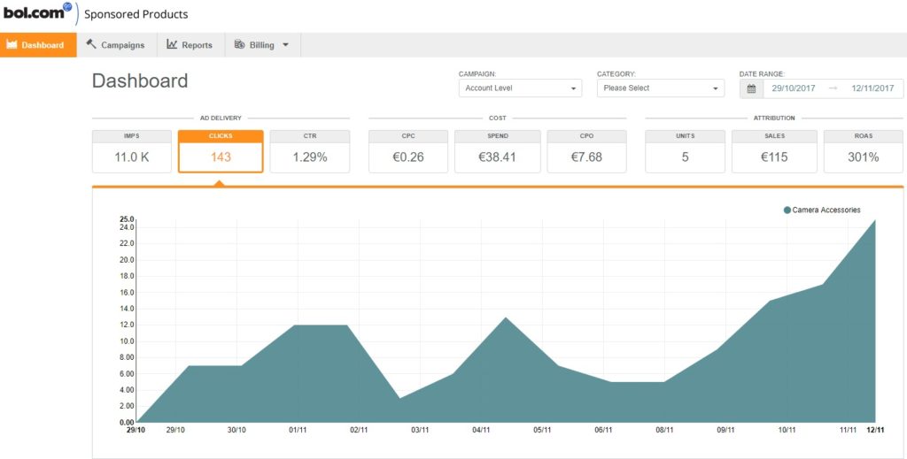In tegenstelling tot Google Ads hanteert bol.com minimum-CPC’s. Je kunt meebieden vanaf € 0,25. Met dat bod doe je automatisch mee aan de veilingen voor de categorieën waar de door je gekozen producten onder vallen. Biedingen kun je vervolgens op categorie- of productniveau hanteren. De resultaten van de campagne kun je inzien via een overzichtelijke interface.