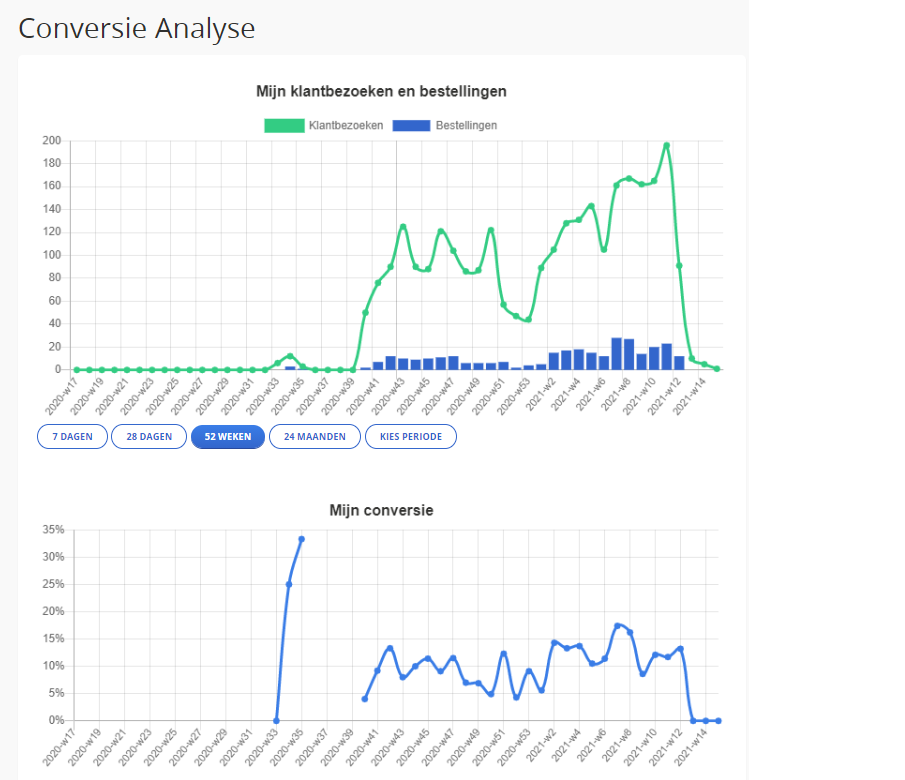 De basisinformatie is nu gedeeld, de volgende stap is het optimaliseren van de titels en product omschrijvingen. Voor de titel is belangrijk dat de productkenmerken hierin terugkomen. Denk daarbij aan merk, producttype, kleur, maat etc. Daarnaast raden we je aan om de zoektrends op Bol.com te analyseren. Hiermee kun je voor jouw producten achterhalen welke termen veelgebruikt worden. Als je deze termen vervolgens in jouw titel verwerkt, kan je dit veel extra verkeer en verkoop opleveren. Zie onderstaande afbeelding voor een voorbeeld van een product dat in week 53 van 2020 geoptimaliseerd werd en wat dit daarna met de bezoeken en bestellingen deed.